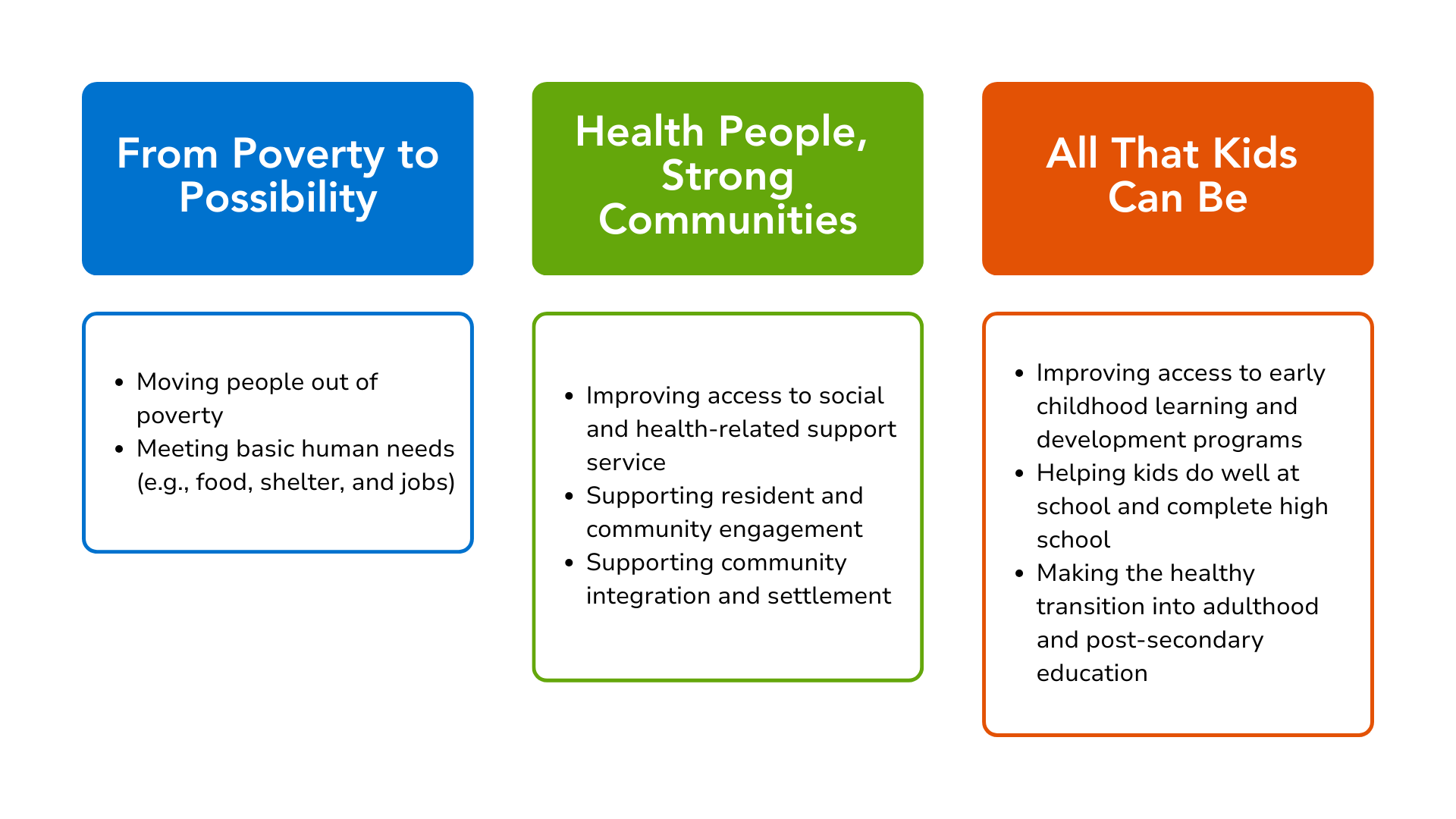 Community impact is about achieving meaningful, long-term improvements to the quality of life in Canadian communities, by addressing not just the symptoms of problems but also getting at the root causes. It’s about making fundamental changes to community conditions.
